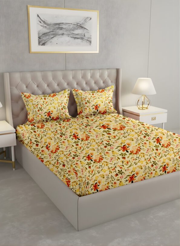The Ackross Bare Basics Floral Queen Bedsheet is made from 100% cotton with a comfortable 104 TC weave, offering breathable softness for everyday comfort. Sized at 224 × 254 cms, it fits queen beds perfectly and includes matching pillow covers (46 × 69 cms). Easy to maintain and designed for daily living, it brings effortless style and dependable comfort to your bedroom—Ackross, Your Home’s Better Half.
