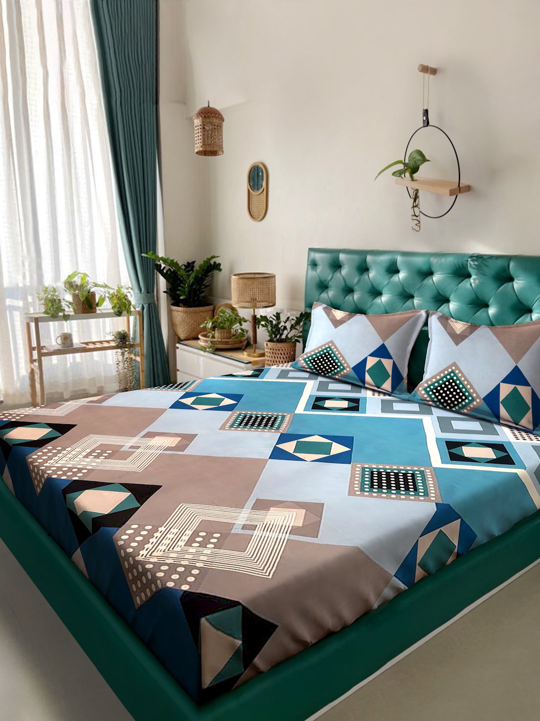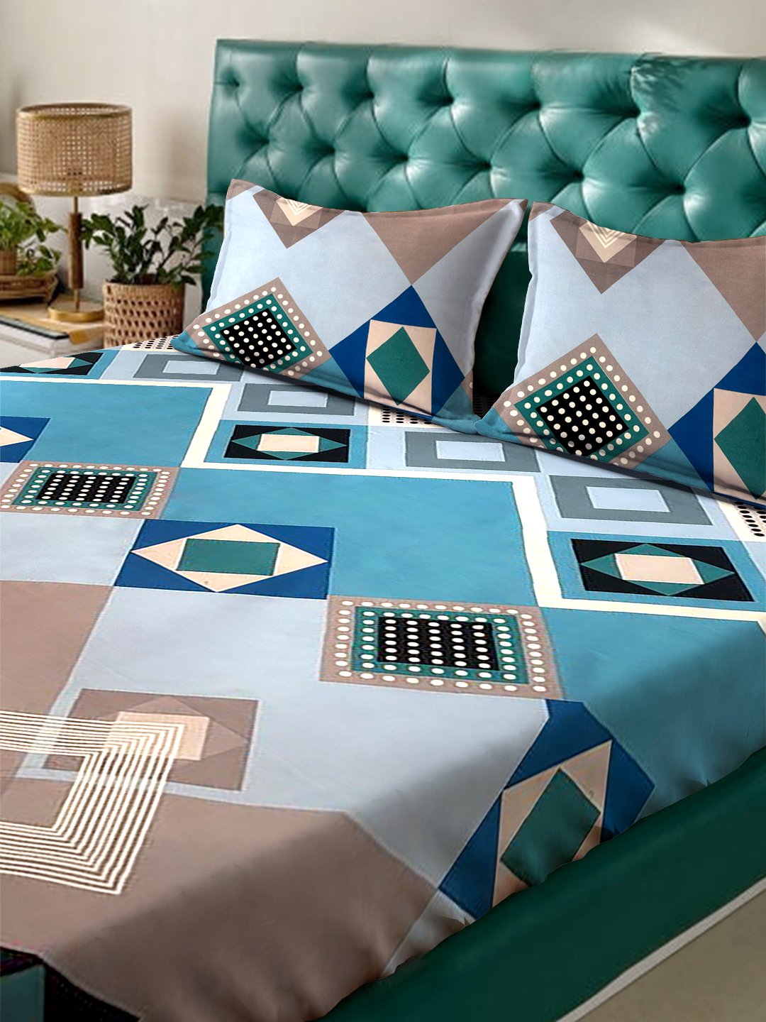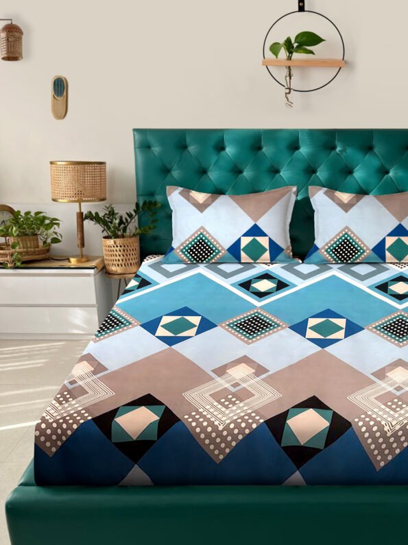 Blossom Royale Geometric Teal-Brown Double Bedsheets